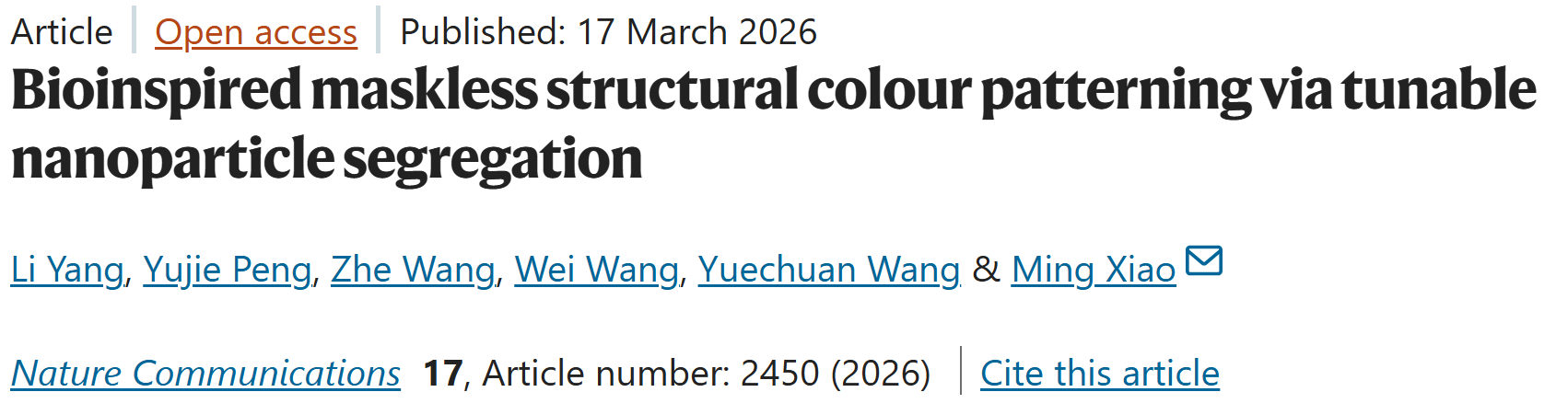 1. Yang, L., Peng, Y., Wang, Z, Wang W., Wang Y., Xiao M. Bioinspired maskless structural colour patterning via tunable nanoparticle segregation. Nat Commun. 2026, 17: 2450.