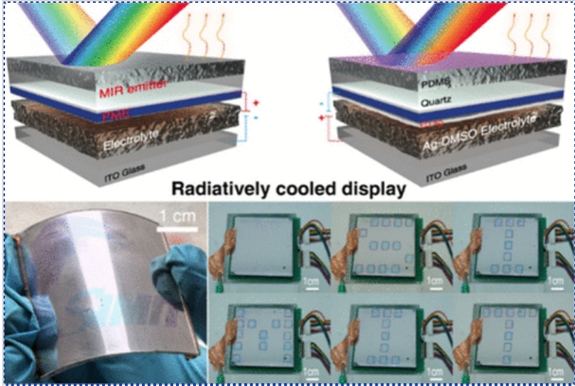 课题组与中科院上海微系统所王博翔老师合作的基于电致变色的动态辐射制冷器件发表在知名期刊ACS Energy Letters上,题为“Daytime Radiative Cooling with Electrochemically Driven Dynamic Colors”。 彩色日间辐射制冷材料因其在美学敏感领域的热管理应用潜力而备受关注。然而,现有彩色制冷材料仅能呈现静态色彩,且无法在保持持续低于环境温度制冷能力的同时实现色彩切换——这主要源于色彩变化时显著增加的太阳光吸收,限制了其在户外动态信息显示等场景的应用潜力。为突破这一技术瓶颈,本文成功研发出动态日间辐射制冷器件,首次通过电化学驱动同步实现色彩转换与辐射制冷功能。该技术通过可动态重构的光学纳米腔(基于可逆金属电沉积),在电致变色领域首次实现了窄带共振吸收激发/湮灭的颜色动态调控。该器件在阳光直射环境下可实现较内部空气温度低2.6-5.3℃的制冷效果,同时具备高稳定性与柔性的可编程动态色彩显示能力。此项研究显著拓展了辐射制冷技术的应用场景,为新一代节能型多功能智能设备的可持续发展提供了全新范式。