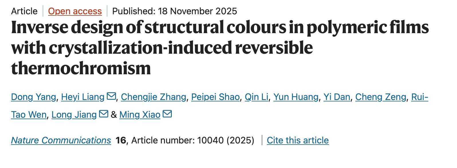 2. Yang, D.; Liang, H.; Zhang, C.; Shao, P.; Li, Q.; Huang, Y.; Yi, Dan.; Zeng, C.; Wen, R.; Jiang, L.; Xiao, M. Inverse design of structural colors in polymeric films with crystallization-induced reversible thermochromism, Nat. Commun. 11040(2025)