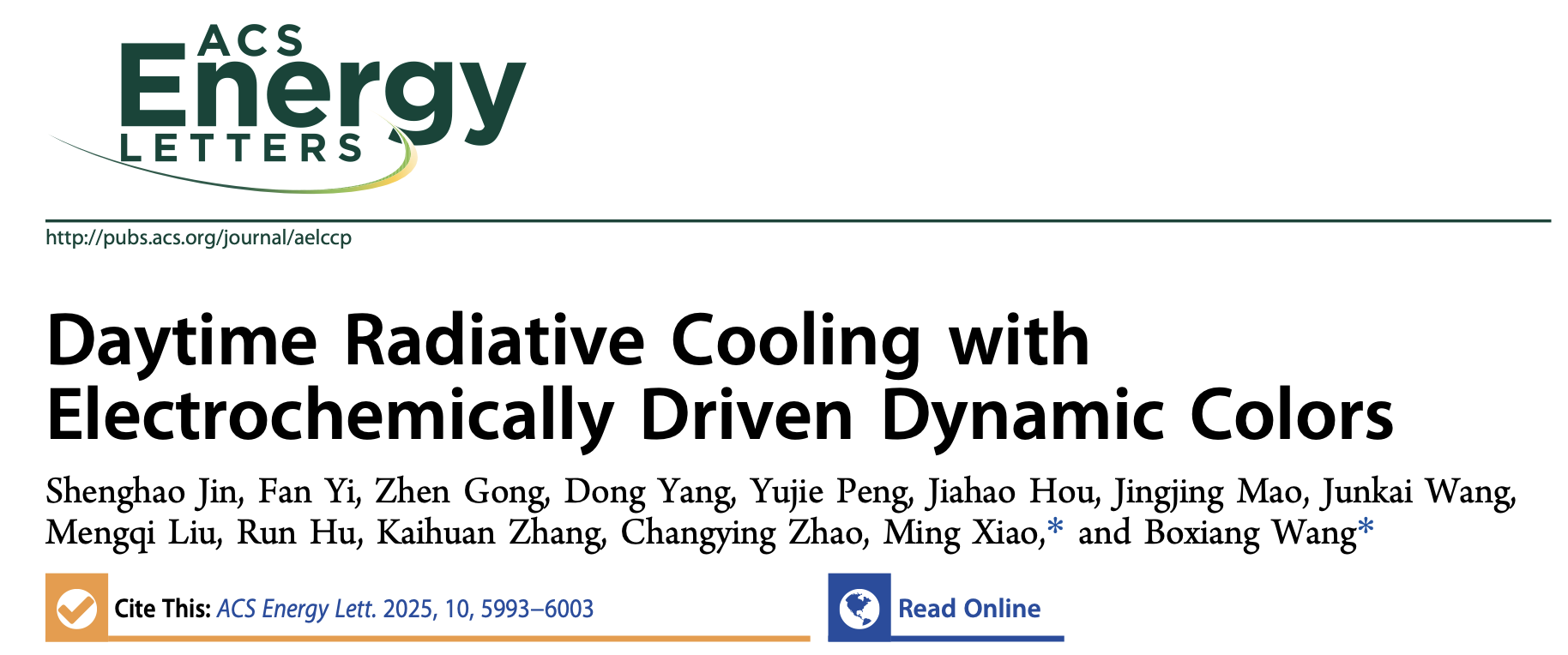 3. Jin, S.; Yi, F.; Gong, Z.; Yang, D.; Peng, Y.; Hou, J.; Liu, M.; Tao, T.; Zhao, C.; Xiao, M.; and Wang, B. An electrochemically driven dynamic structural color device with persistent radiative cooling capability, ACS Energy Lett. 2025,10,5993-6003.