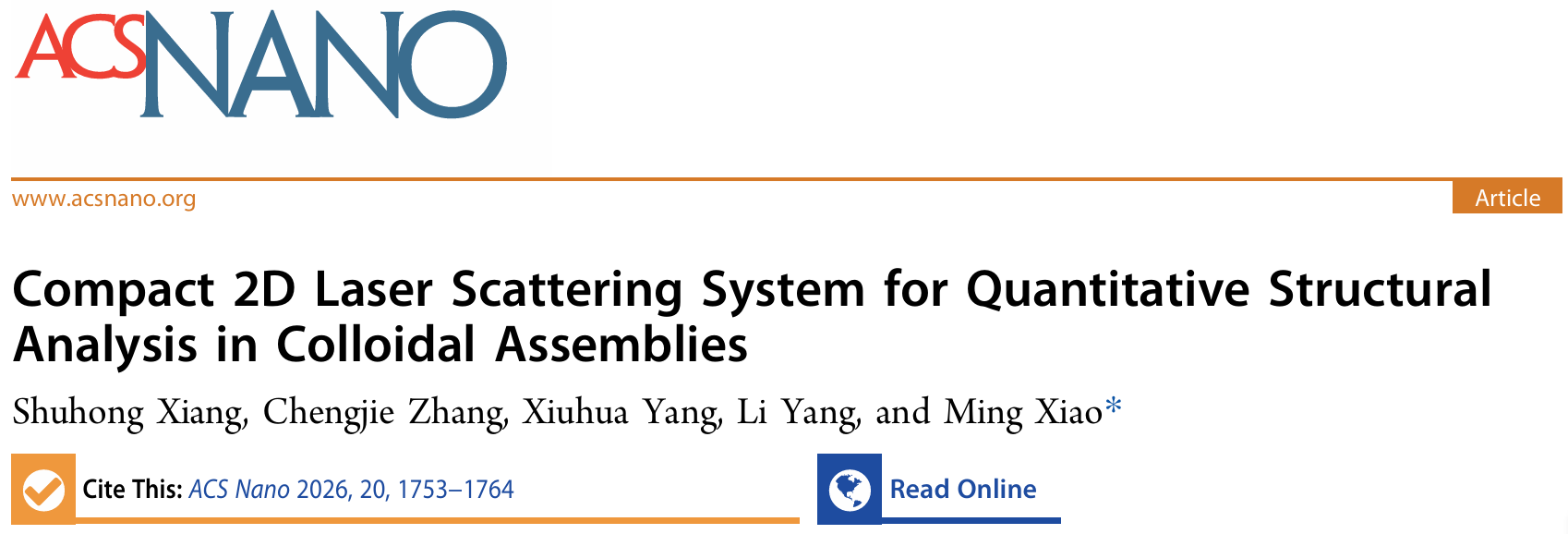 1. Xiang S, Zhang C, Yang X, Yang L, Xiao M. Compact 2D Laser Scattering System for Quantitative Structural Analysis in Colloidal Assemblies. ACS Nano. 2026, 20(1), 1753-1764.